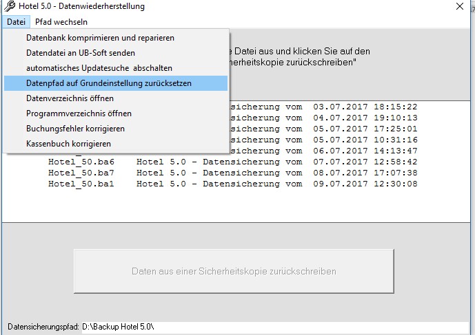 Nachdem sich das Fenster öffnet, klicken Sie oben links auf "Datei - Datenpfad auf Grundeinstellung zurückstellen" ![]() | |